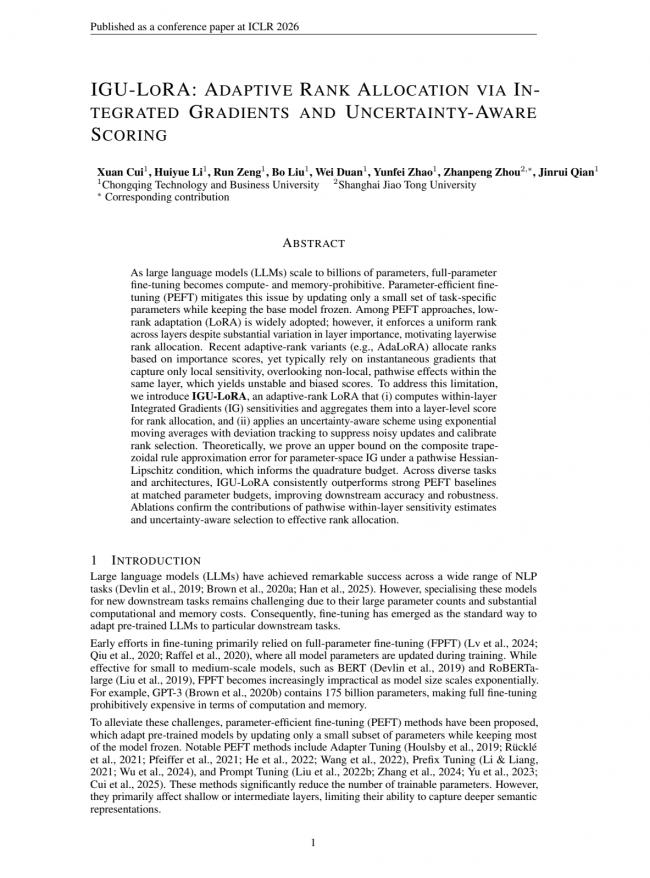 在扎实推进学科专业建设、强化前沿基础研究能力的背景下,重庆工商大学跨境电商智能合规检测团队在大模型微调理论及其应用领域取得重要突破。近日,由团队完成的研究论文“IGU-LoRA: Adaptive Rank Allocation via Integrated Gradients and Uncertainty-Aware Scoring”被人工智能与机器学习领域国际顶级会议——国际学习表征大会(ICLR 2026)录用。该成果标志着我校在大模型微调理论及跨境电商合规检测应用方面取得原创性突破,彰显出学校在前沿人工智能基础研究与国际竞争中的科研实力。